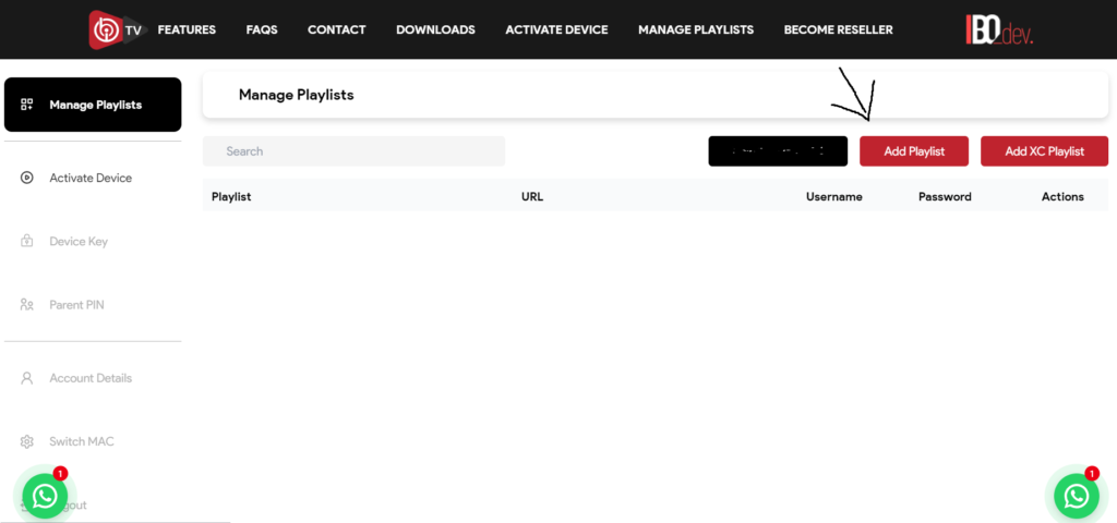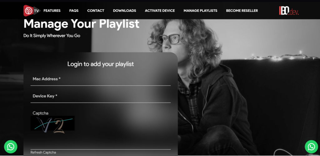 2. Visit ibo Player website https://iboplayer.com/ and Click “Manage Playlists” in Menu section. Then Enter the MAC Address and Device Key displayed on your device screen and Click “Login“.